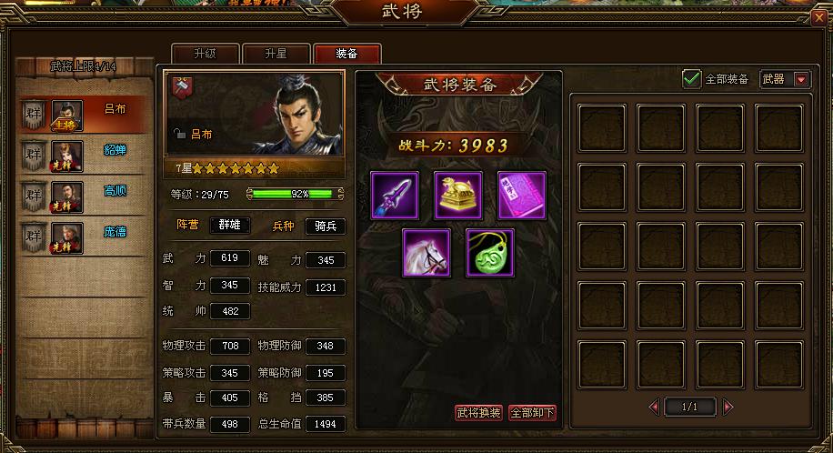 a、对应武将星级,武将只能穿戴装备星级比武将星级低的装备。星级越高,装备属性越高,相对的强化等级越高。